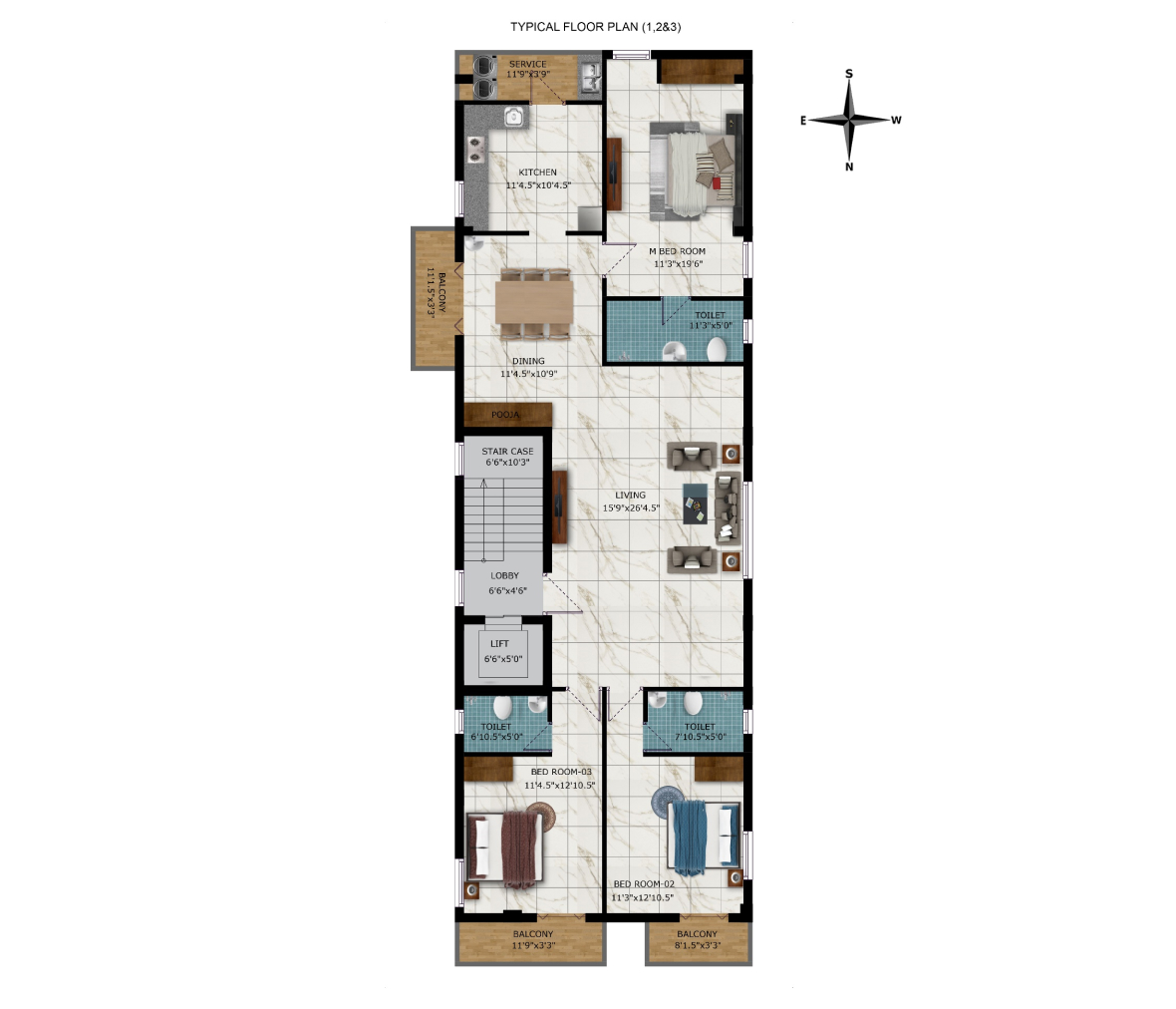 - Living, Dining & Bedrooms, 600 x 600 Vitrified tiles with skirting. Kitchen, Balconies, Toilets and Wash / service Areas Non Slippery Ceramic tiles.