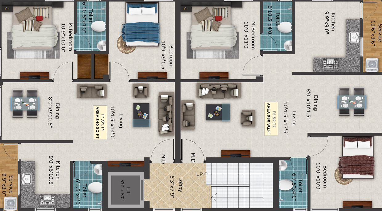 - Living, Dining & Bedrooms, 600 x 600 Vitrified tiles with skirting, Kitchen, Balconies, & Toilets, Non slippery Ceramic Tiles.