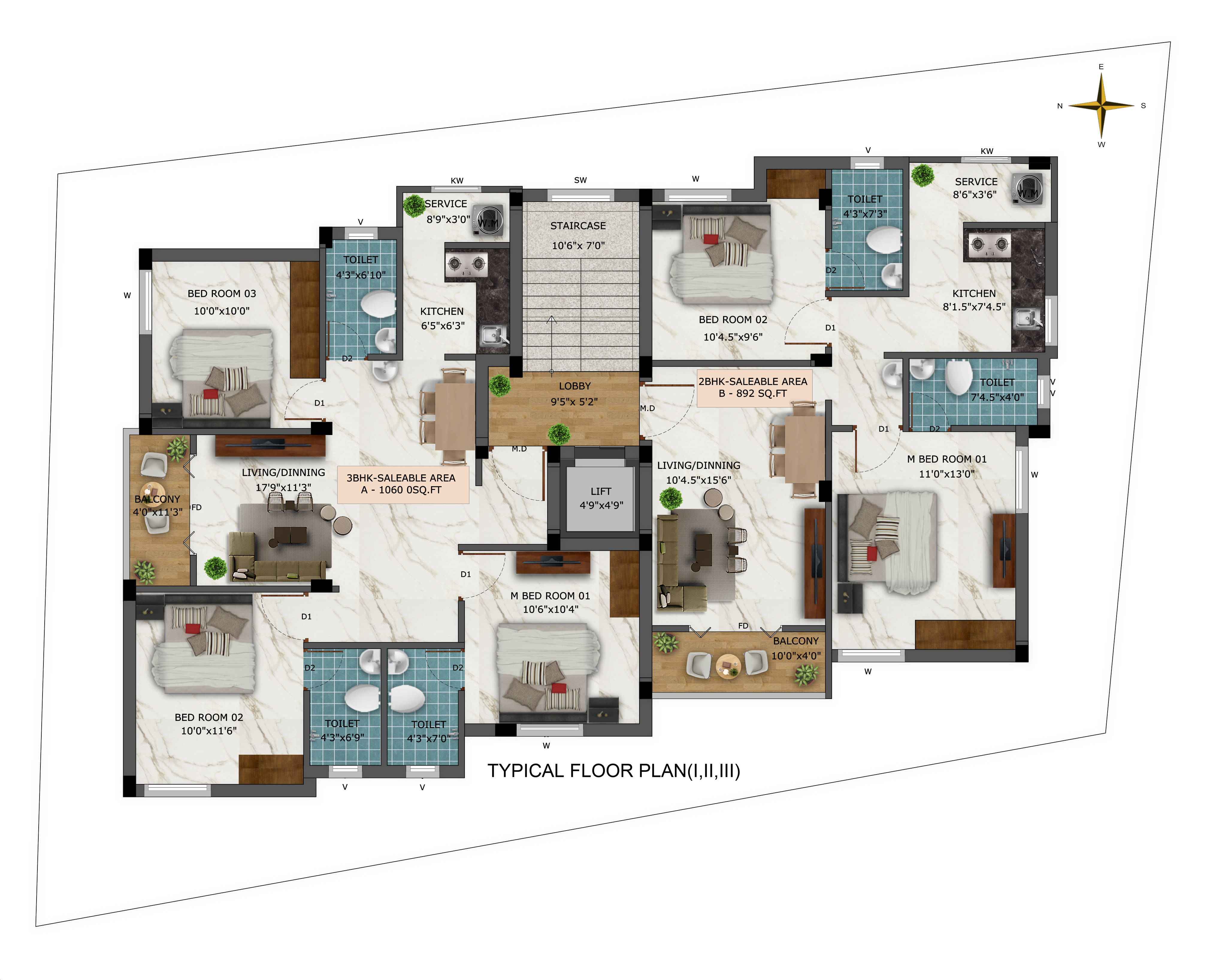 - Living, Dining & Bedrooms, 600 x 600 Vitrified tiles with skirting. Kitchen, Balconies, Toilets and Wash/ service Areas - Non Slippery Ceramic tiles.